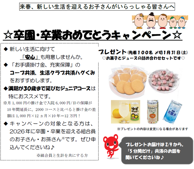 卒園・卒業おめでとうキャンペーン Tweet ◇申込書提出◇ 〆切:1月31日(土) 先着100名 (申込みチラシ) こちらをクリック ◇お問合せ◇ 右記のリンクページにある各センター、もしくはお問い合わせフォームより こちらをクリック