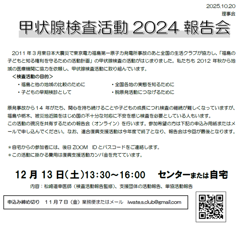 甲状腺検査活動2024報告会 @盛岡・オンライン 開催日:2025年12月13日 Tweet ◇参加申込み◇ (申込みチラシ) こちらをクリック ◇お問合せ◇ 右記のリンクページにあるセンター、もしくはお問い合わせフォームより こちらをクリック