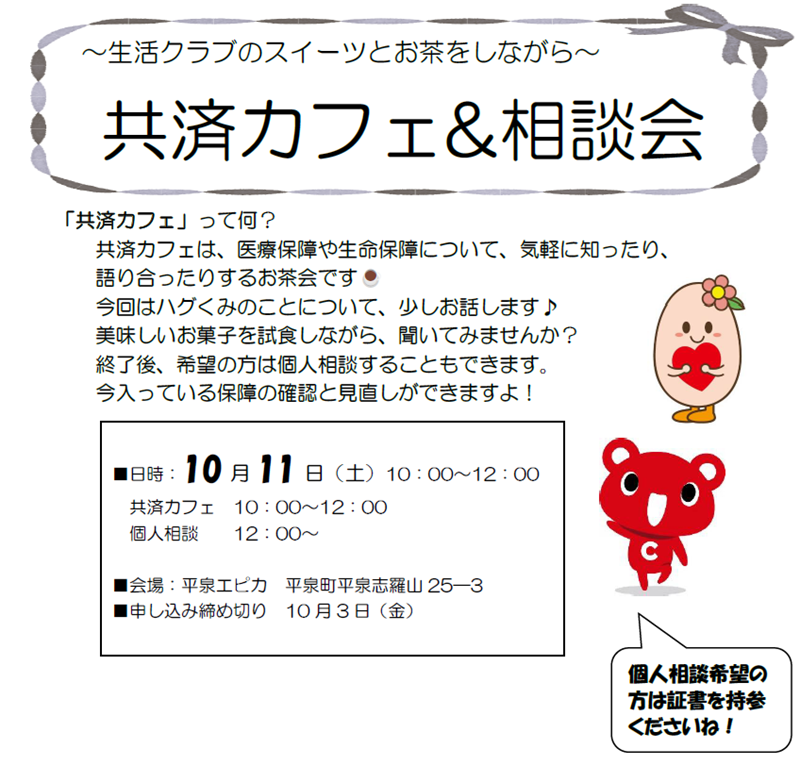 共済カフェ&相談会 @平泉 開催日:2025年10月11日 Tweet ◇申込みチラシ◇ こちらをクリック ◇お問合せ◇ 右記のリンクページにあるセンター、もしくはお問い合わせフォームより こちらをクリック