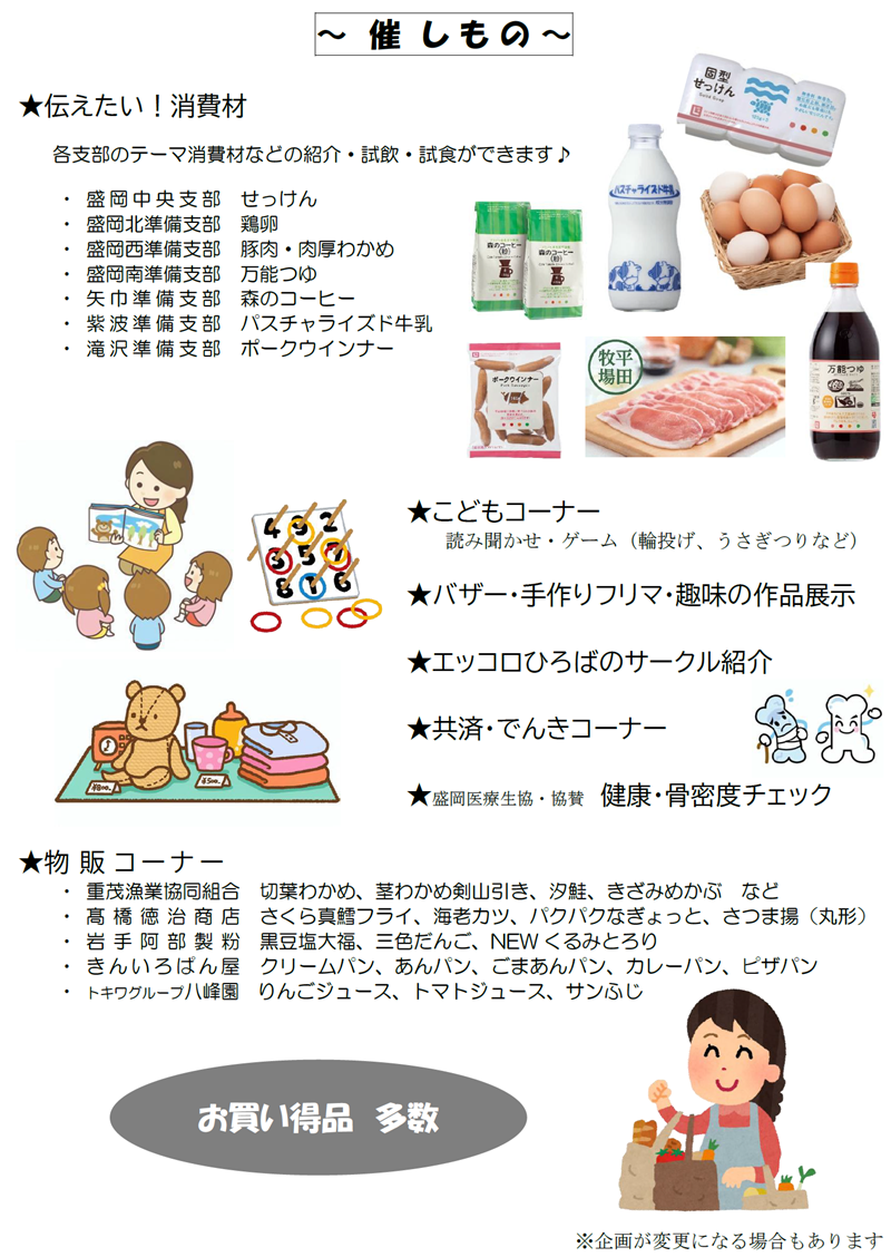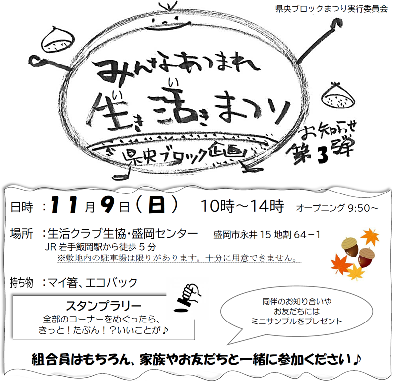 みんなあつまれ 生き活きまつり 開催日:2025年11月09日 Tweet ※提供品などの募集については ⇒ こちらをクリック!! ◇申込書提出◇ 〆切:10月24日(金) (申込みチラシ) こちらをクリック ◇お問合せ◇ 右記のリンクページにあるセンター、もしくはお問い合わせフォームより こちらをクリック