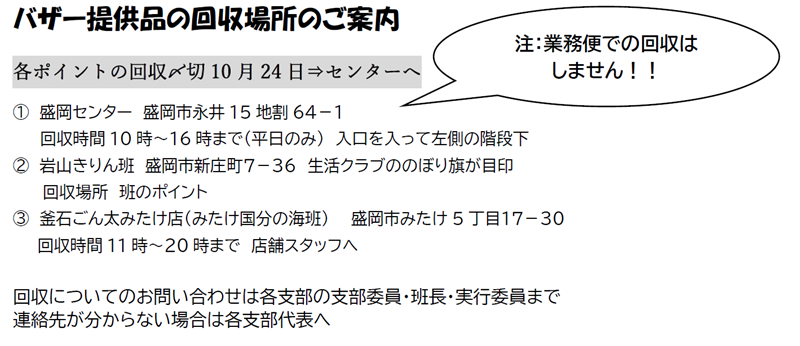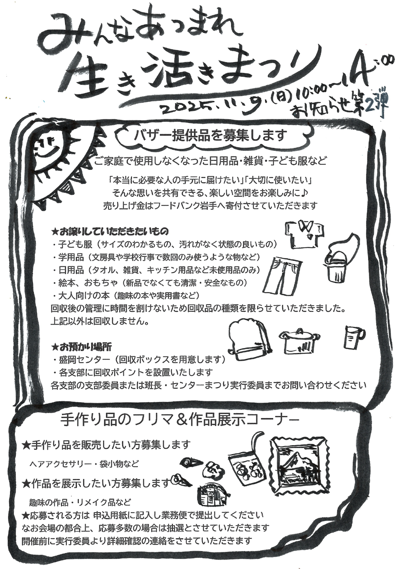 ~みんなあつまれ 生き活きまつり~ 提供品などを募集します! Tweet ◇申込用紙◇ 〆切:10月24日(金) (申込みチラシ) こちらをクリック ◇お問合せ◇ 右記のリンクページにあるセンター、もしくはお問い合わせフォームより こちらをクリック